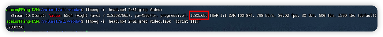 | ffmpeg -i head.mp4 2>&1|grep Video:|awk '{print $11}'