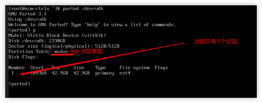 1. 执行命令 parted /dev/vdb,并输入“p”,按“Enter”键,查看当前的分区信息。